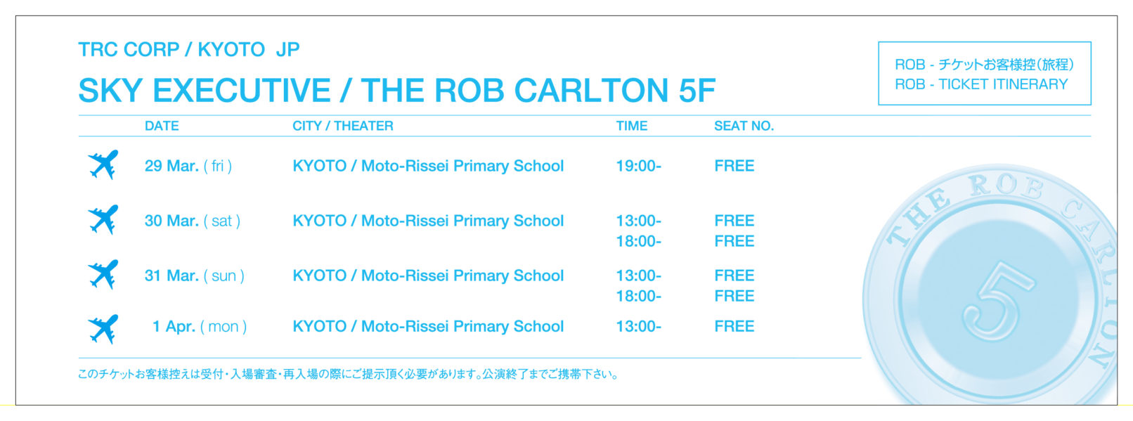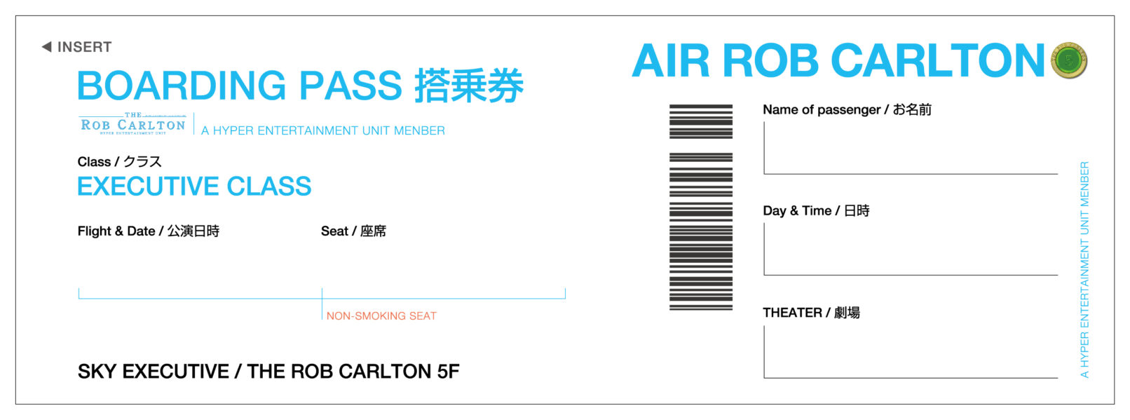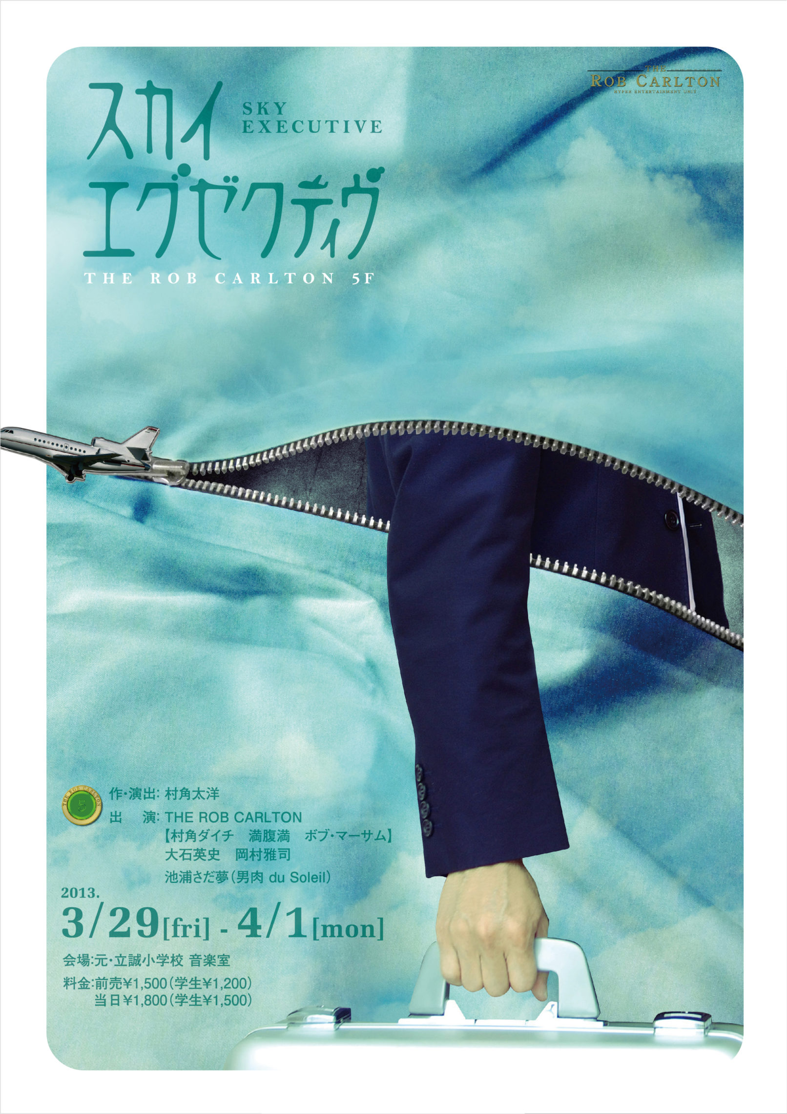 エグゼクティブたちが飛行機へ乗り込み、現地に向かうストーリー。演劇のチラシというものにどうアプローチしていいか考え、広告表現をグラフィックに使おうとした。